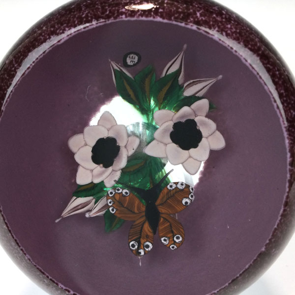 Purple Overlay Butterfly Paperweight by William Manson. A millefiori butterfly hovers over pale lavender flowers with buds and green stems. Signature cane inside. Starburst cut on the bottom. Measures approximately 3.5″ diameter x 2″ high.