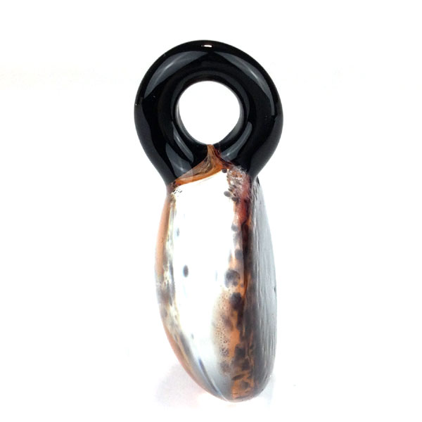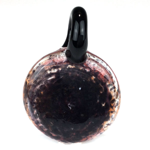 Red and Orange Wig-Wag Pendant by Bill Futer, WheatonArts Flamework Studio Volunteer Artist. This flameword glass pendant has a Wig-Wag design on the front in orange and red. It has a black frit back and measures approximately 1.5″ high including the loop. It measures 1″ wide.