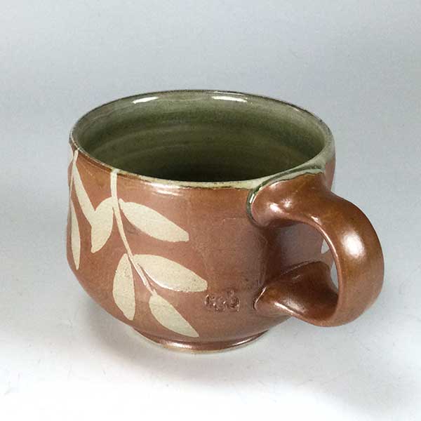 A gentle trail of leaves grace the surface of this salt glaze chowder mug. Although the dimensions are nearly identical, the firing process makes each piece unique, like sun and shadow on a summer afternoon. Measuring 3.75″ wide at its rim and 3″ tall, with a distinctive shape and generous capacity, the chowder mug is versatile. Stamped with Samantha's initials to the left of the handle base.