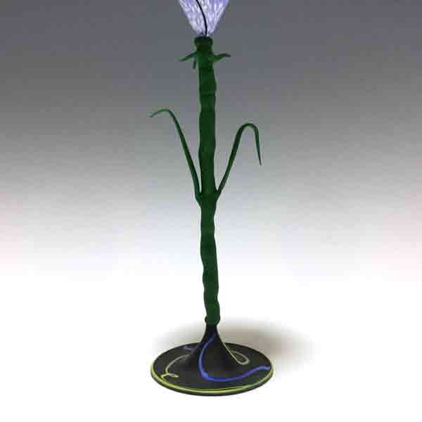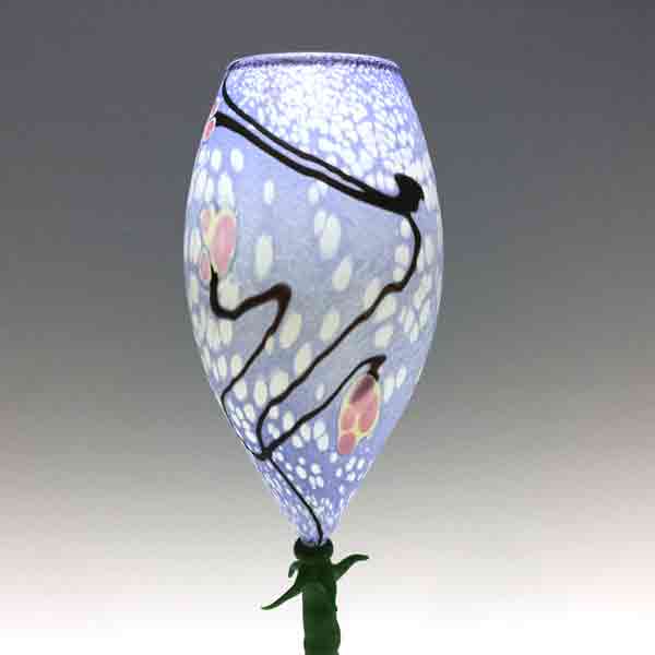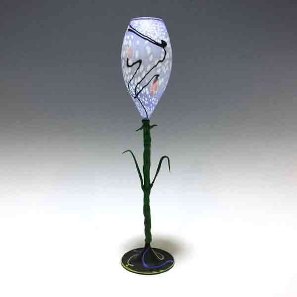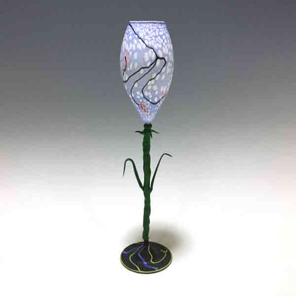 Shane Fero – Floral Goblet with Green Stem. This flameworked glass goblet has a pale blue background with pink buds on black branches. It is accented with a green stem and leaves. Flameworked Glass & acid etched