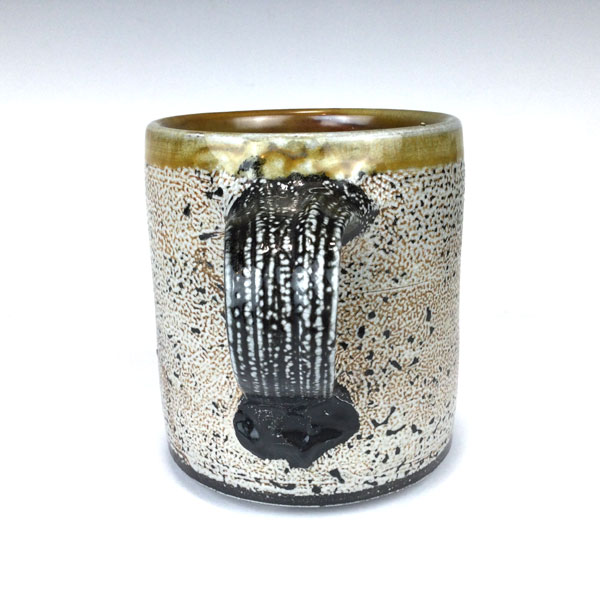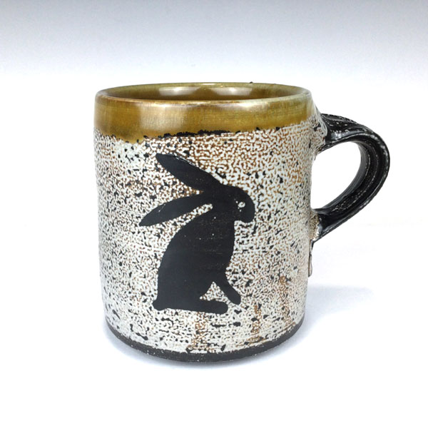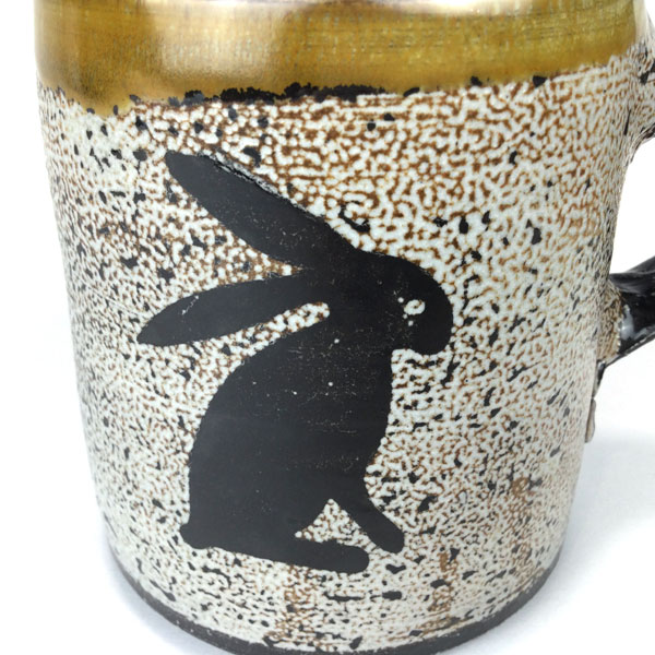 Rabbit Pottery Mug by Terry Plasket. This pottery mug was handcrafted at WheatonArts by Resident Potter, Terry Plasket. It is made from porcelain, salt glaze and uses the flashing slip technique. It can be used for hot or cold liquids and can be put in the microwave and dishwasher. Signed by the artist. Artist Card and Gift Box Included. Approx. 3.5″ h x 5″ wide including handle.