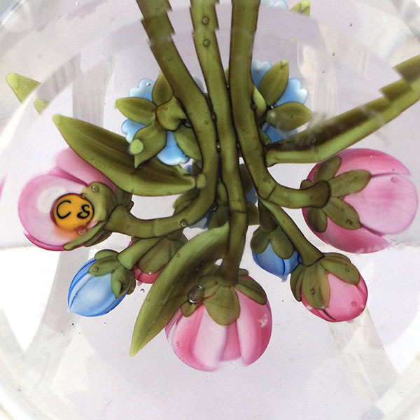 As a self-taught lampworker, I had experimented with various lampworking techniques finding the results beautiful, but quite fragile. I soon realized that I could take the fragile lampworked elements and encase them in glass. I was hooked on the paperweight technique. My paperweights emerged half a dozen years later through trial, error, and perseverance.