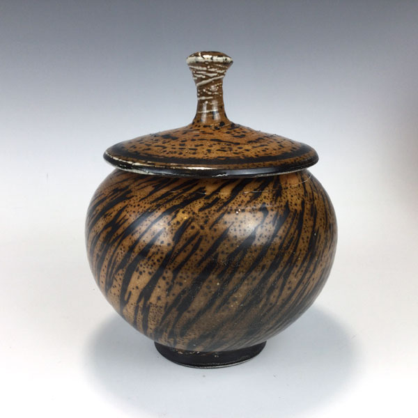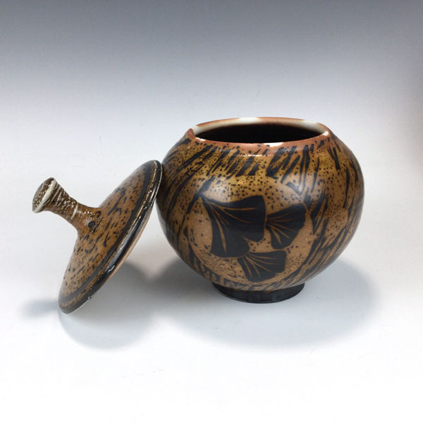 Ginkgo Leaf Lidded Pottery Bowl by Terry Plasket. This pottery lidded bowl was handcrafted at WheatonArts by Resident Potter, Terry Plasket. It is food safe and can be used for a snack jar or decoratibe art piece. It can be put in the microwave and dishwasher. Signed by artist. Artist Card and Gift Box Included. Approx. 7.25″ h included lid x 5″ diameter. Each piece is handcrafted therefore it may vary slightly from the image.