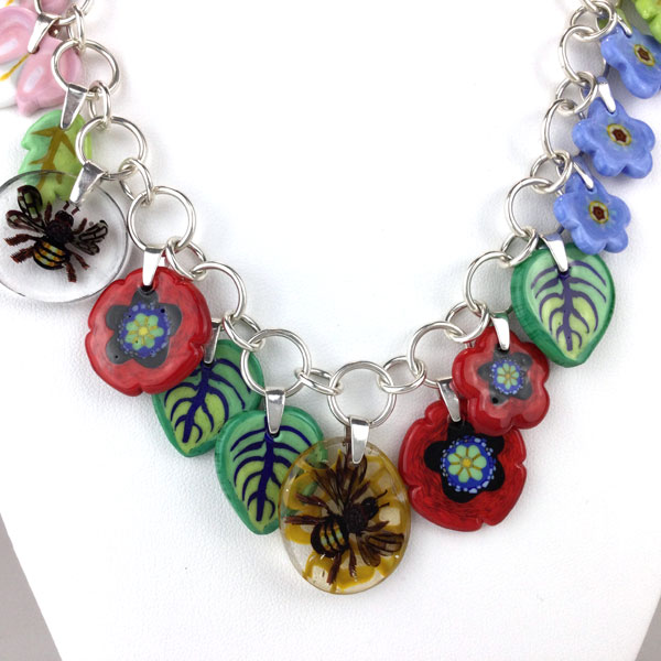 Summer Cane Necklace by Lucie Kovarova-Weir. This flameworked glass cane necklace features slices of flowers, leaves and honeybees. It meaures 16″ and has a sterling silver chain and clasp.
