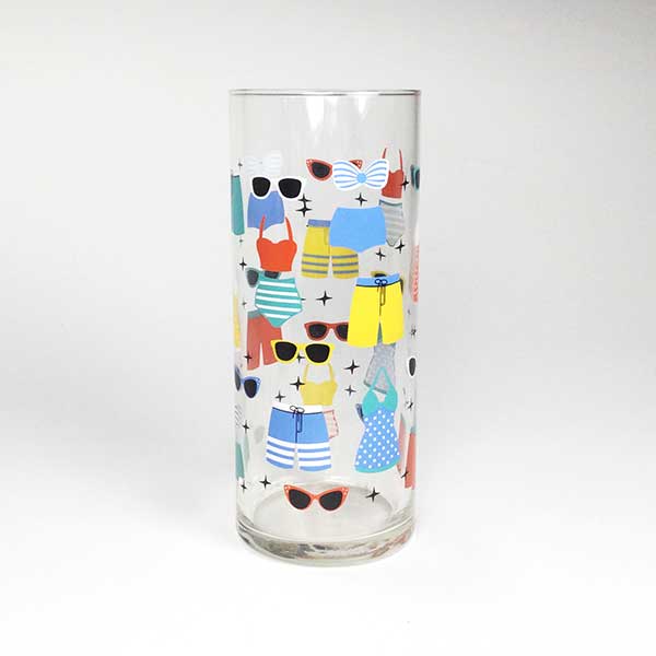 Embrace warm summer days with colorful, fun-in-the-sun glass tumblers. A wrap-around motif of vintage styled swimsuits and sunglasses brings a carefree vibe to any tabletop. At 6.25″ tall, they're ideal for an ice-filled glass of lemonade. The 2.5″ diameter gives them a tall, slim appeal for summer cocktails.