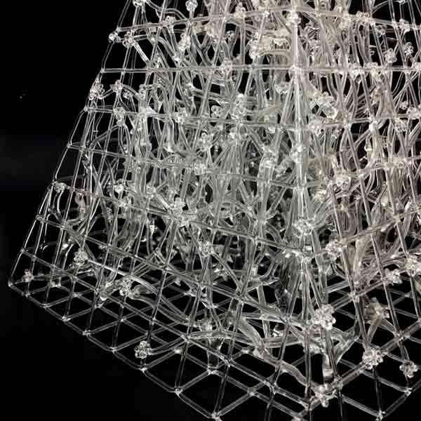 The Convergence of Barrier I by Eunsuh Choi. Flameworked Borosilicate Glass Sculpture. Measures Approximately 10″ w x 15″ h x 10″ d.
