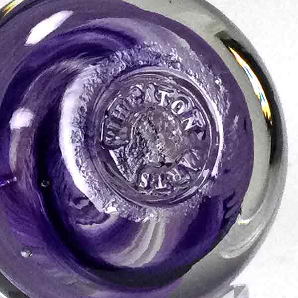 Lavender and deep amethyst tones swirl around a clear central bubble in this glass paperweight made at WheatonArts. Molten glass is rolled in vibrant chips of color, then handformed into a solid swirled orb with a flat base. The molten glass is pressed at its base with a WheatonArts stamp for the final touch. Although similar in size and color, each orb will be distinctly different, due to the unique process of creation. Orbs measure 2.5″ -3″ in diameter and 2″-2.5″ in height. Each is gift boxed with a WheatonArts enclosure.